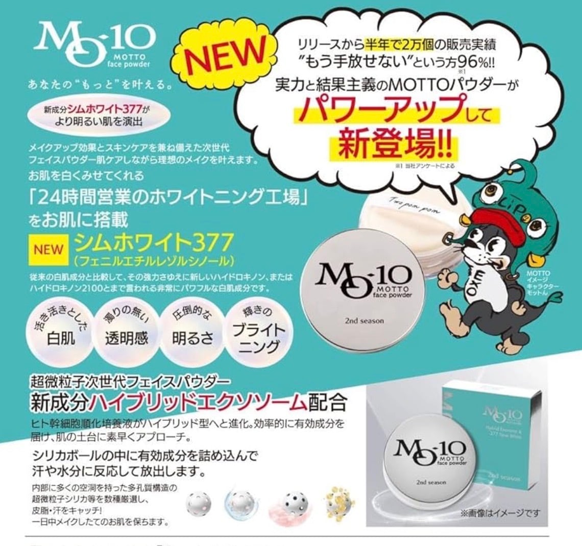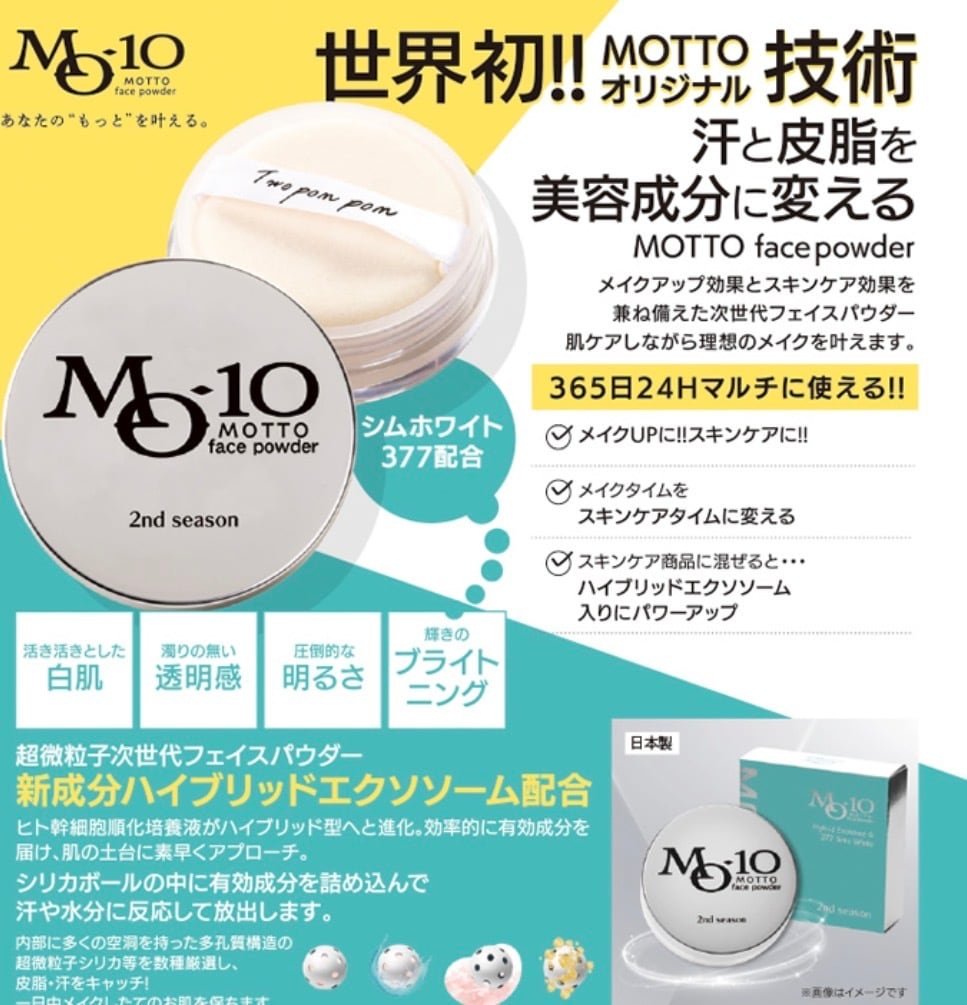Mottoは、ヒト幹細胞順化培養液+ハイブリッドエクソソームを配合した次世代フェイスパウダー。シリカボールの中に美容成分を閉じこめ、汗を利用して美容成分をシリカボールから放出します。メイクアップとスキンケアを同時にアプローチ。これが、Motto最大の特徴です。また光を拡散するフォーカス効果により、しわ、しみ、そばかす、色むらなどの肌の欠点をカバー。エアリーで透明感のある仕上がりは、お肌を陶器のような滑らかなお肌へ導きます。